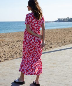 Women’s Red Floral Ruched Waist Jersey Midi Dress with Pockets